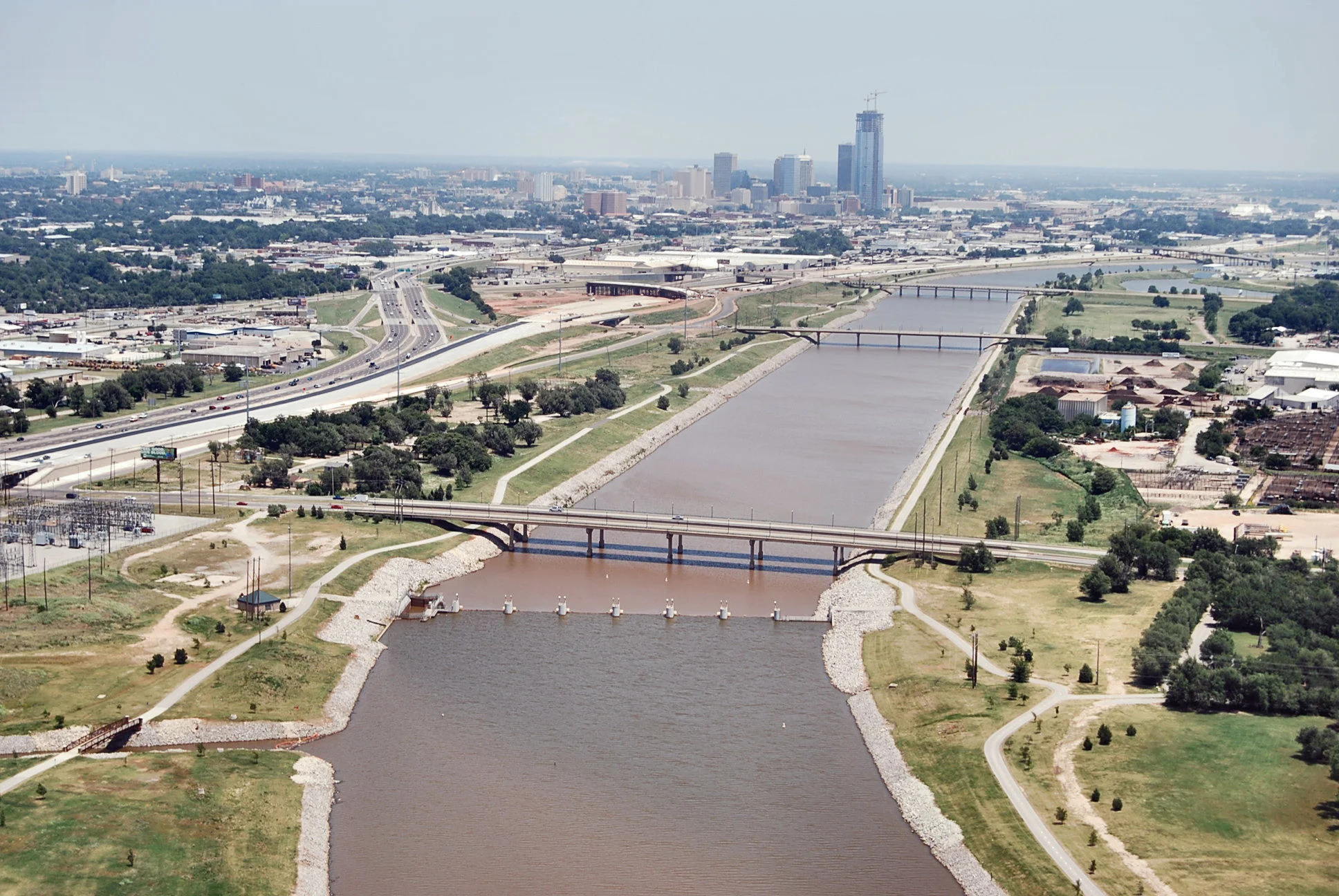 For over thirty-five years Triad Design Group has played an integral role with Oklahoma City visionaries in the development of the Oklahoma River Corridor. The River’s historic beginning was as a naturally meandering, 7-mile stretch of the North Canadian River (NCR) flowing through the City. After a series of damaging floods beginning in the 1920’s, the river was straightened and redirected with a 1950’s flood mitigation project that turned the NCR into an unsightly drainage ditch bisecting OKC geographically and socially.